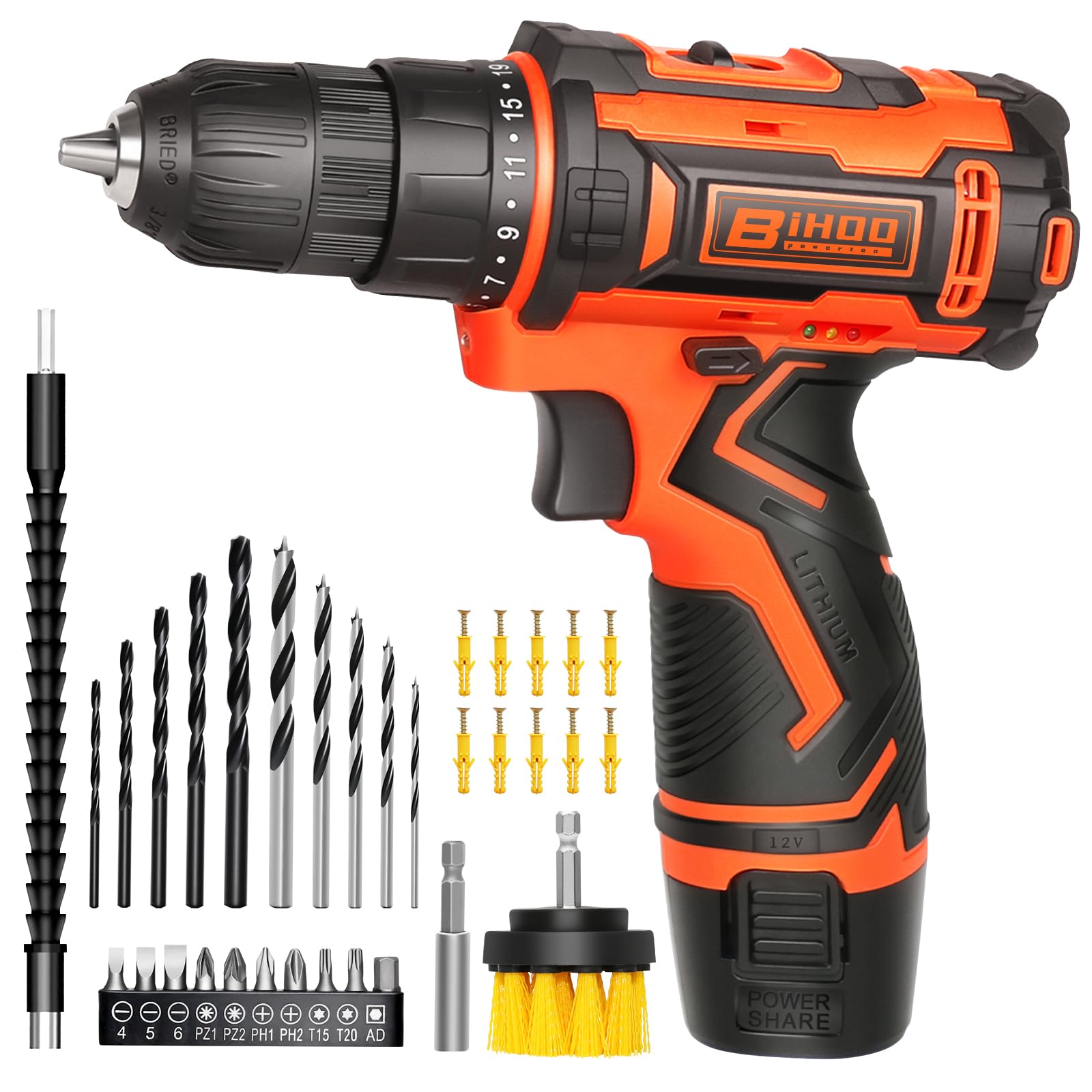 - 【Battery Power Drill Set】This home tool kit with drill contains cordless drill by a max powerful 12-Volt, 2000mAh Lithium-ion battery and 43 pieces drill driver bits for drilling in wood, metal, plastics and all screw drive tasks.