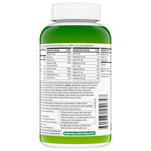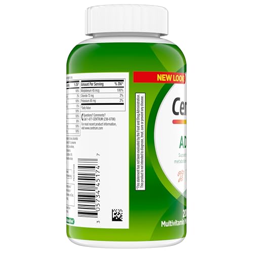 Details: Centrum Adult Multivitamin is a complete multivitamin/multimineral supplement formulated for adults. This daily multivitamin for adults contains 23 micronutrients, including Vitamin D3. These adult vitamins also contain B Vitamins and iron to help support daily energy levels and assist with the metabolism of macronutrients, and antioxidant Vitamins C and E, and zinc for immune support (1). Centrum adult multivitamins contain 100 percent or more of the daily value of iron, Vitamin D3 and Vitamin B12. These multivitamins for adults are also Non-GMO (2) and gluten free vitamins to appeal to a variety of dietary needs. These vitamin tablets feature a smooth coating that makes them easy to swallow. With 200 multivitamin tablets per bottle, it's easy to maintain your overall health by taking one of these vitamins for men and women daily with food (1). Help support full body wellness (1) with Centrum multivitamins, the #1 doctor and pharmacist recommended brand. (1) These statements have not been evaluated by the Food and Drug Administration. This product is not intended to diagnose, treat, cure or prevent any disease. (2) Non-GMO applies to Centrum and Centrum Silver tablets only; learn more at Centrum's official website.