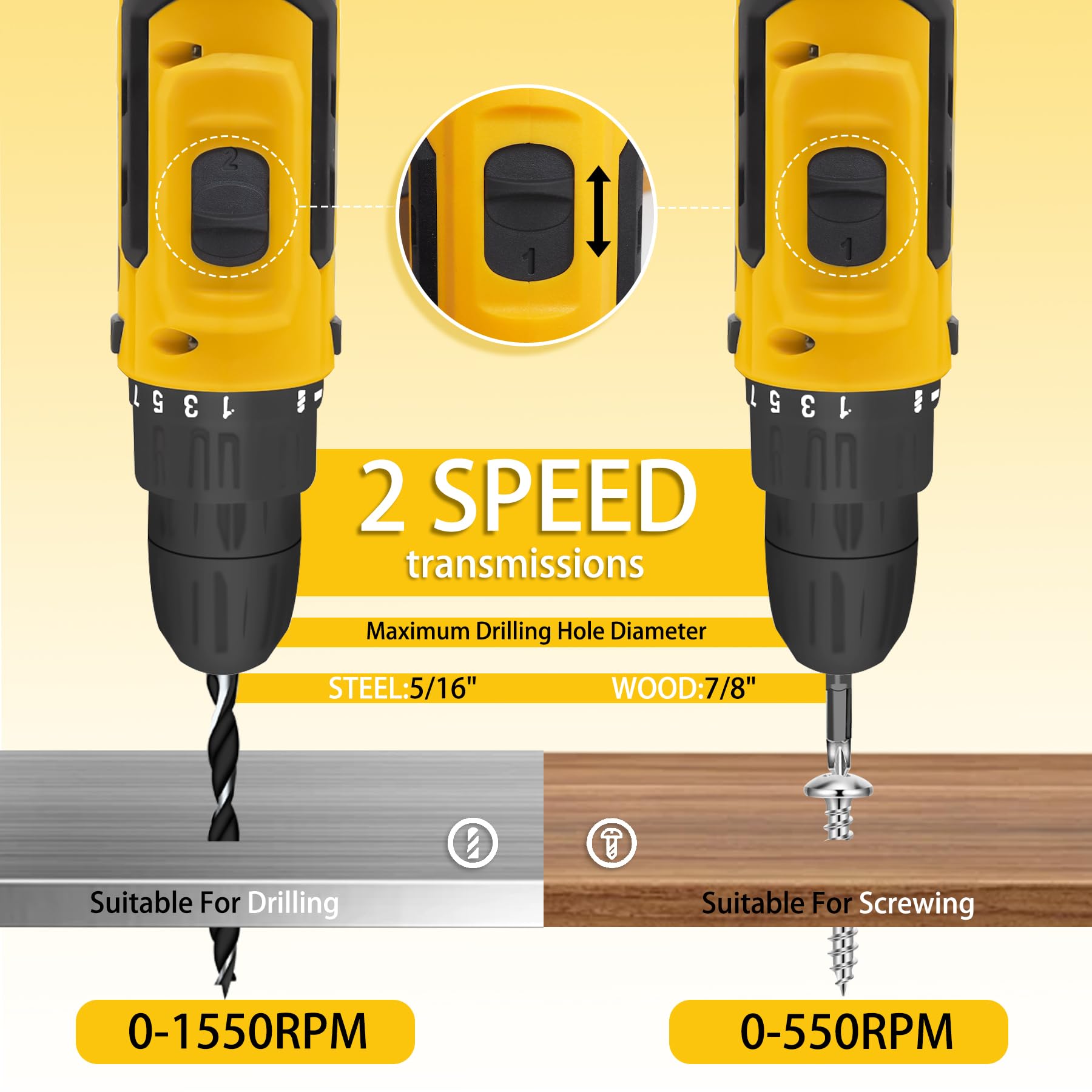 - 【25+1 & 2 VARIABLE SPEED】25+1 torque settings and 2-Speed( ( 0-550 & 0-1550 RPM ) of power drill can provide more precise torque or speed adjustment as required, which helps to prevent sinking a screw too deep, stripping out the head of a screw or even breaking a screw shaft.