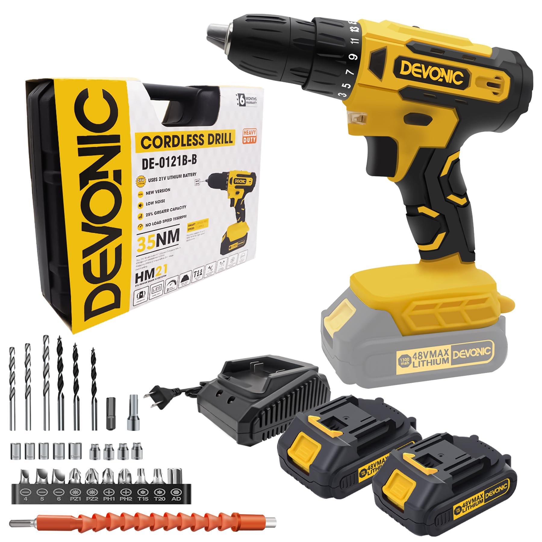 DEVONIC Cordless Drill Set,21V Electric Drill with 2 Lithium Battery and Charger,3/8"Keyless Chuck,25+1 Torque Setting and 28pcs Drill Screwdriver Bits