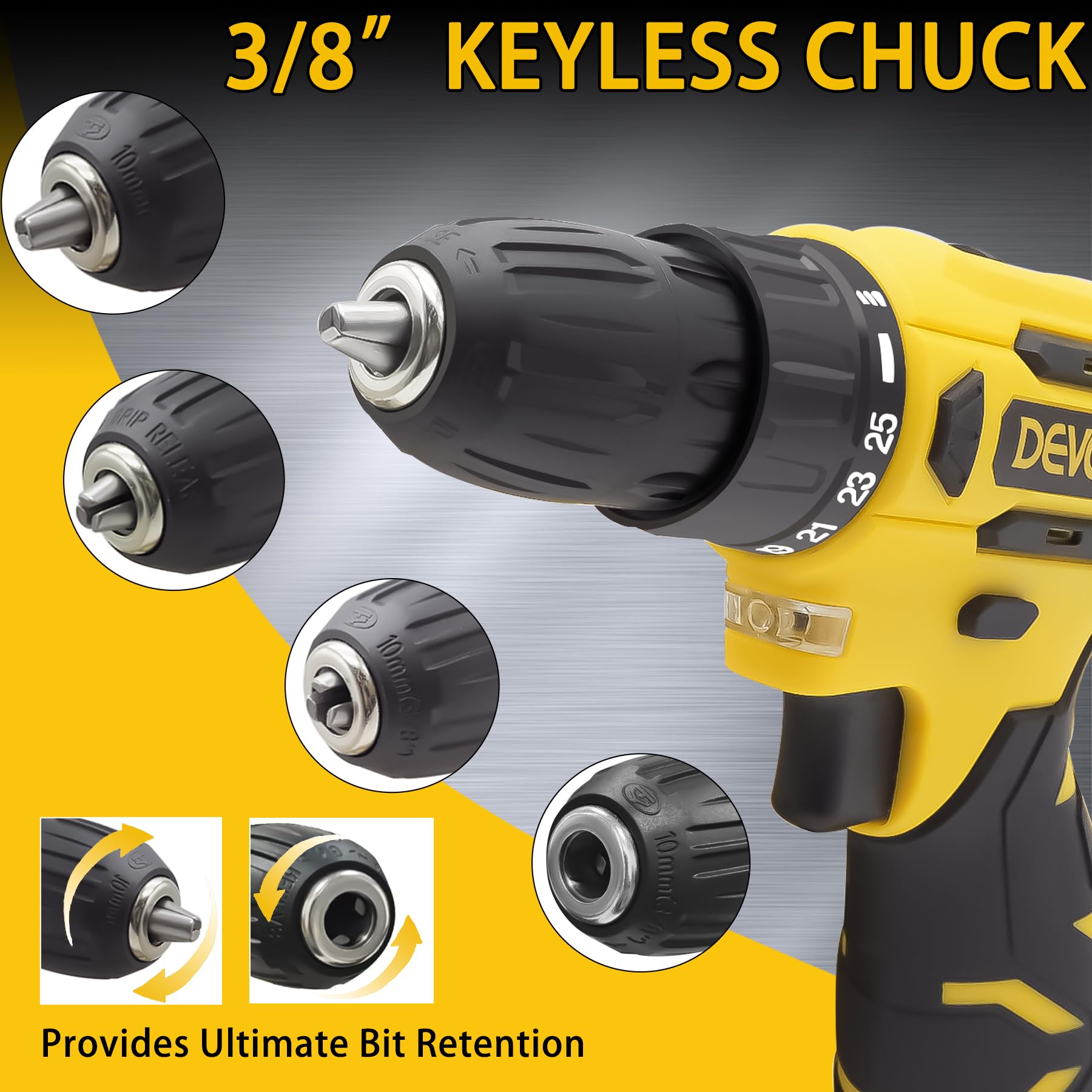 - 【High-Performance Power Drill Set】DEVONIC 12V cordless drill with superior motor, 310 in-lbs (35 NM) of max torque is perfect for drilling wood, metal, plastics, and all screw driving tasks at home, and many other DIY and craft projects. It's good ideal present for ourselves, family and friend.【25+1 & 2 VARIABLE SPEED】25+1 torque settings and 2-Speed( ( 0-550 & 0-1550 RPM ) of power drill can provide more precise torque or speed adjustment as required, which helps to prevent sinking a screw too deep, stripping out the head of a screw or even breaking a screw shaft.