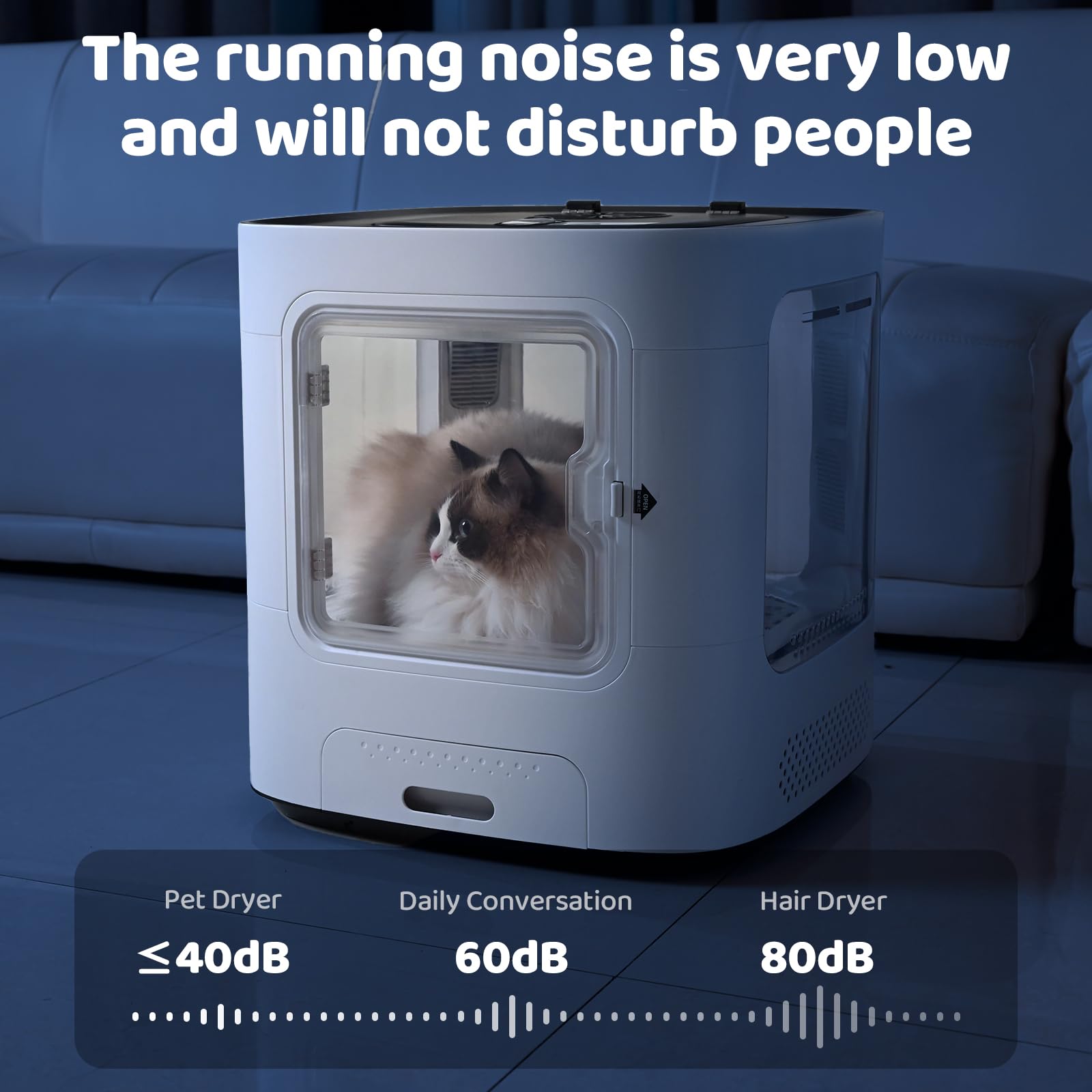 - Low-Noise Comfort: Enjoy a calm grooming process with this Ultra Quiet Smart Dryer Box. Operating at just 40dB, it minimizes stress for your pets, making it especially suitable for cats and small dogs. The Automatic Cat Dryer creates a serene environment where your pets can relax while being dried