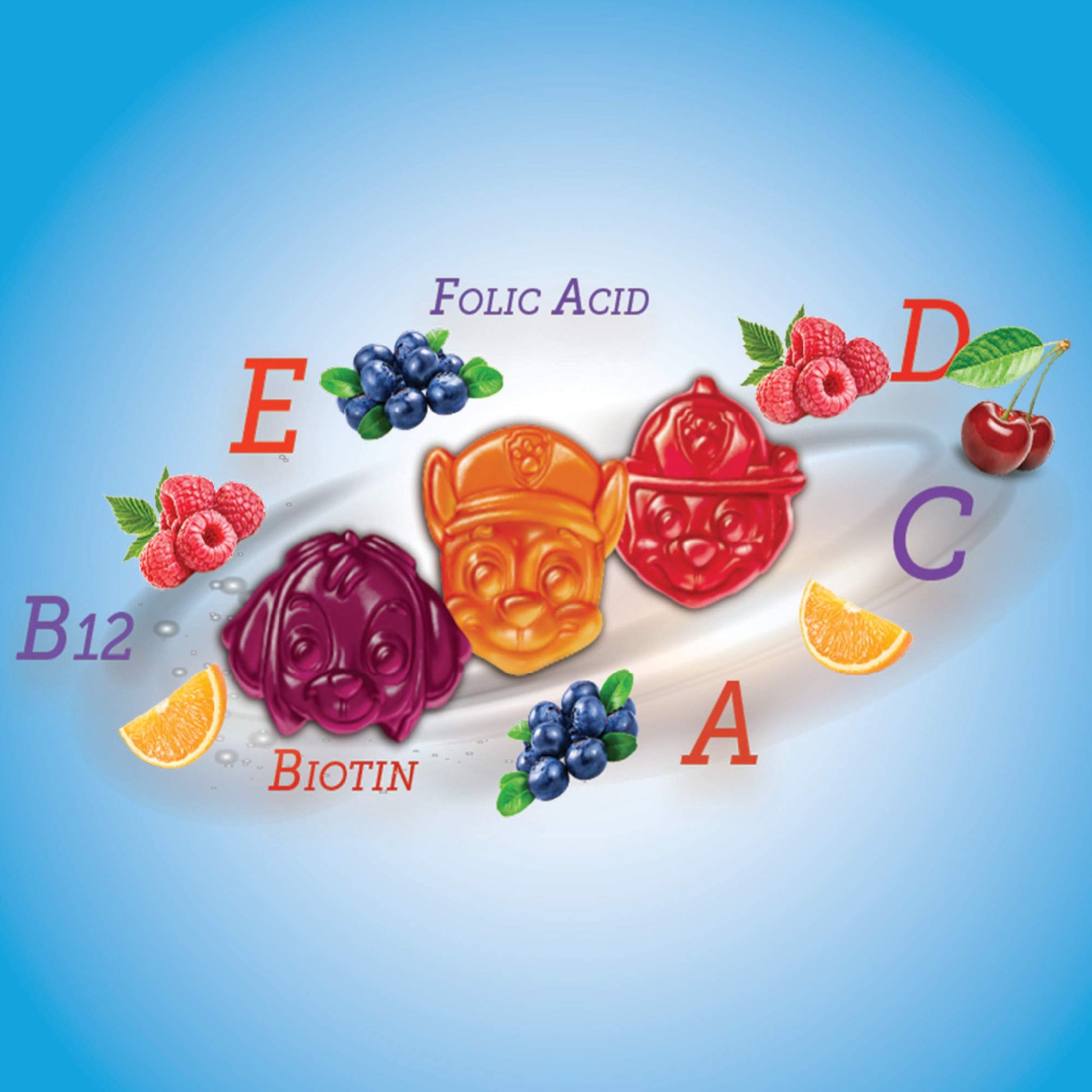 - Delicious Paw Patrol shaped vitamins come in yummy cherry, orange and blueberry flavors.