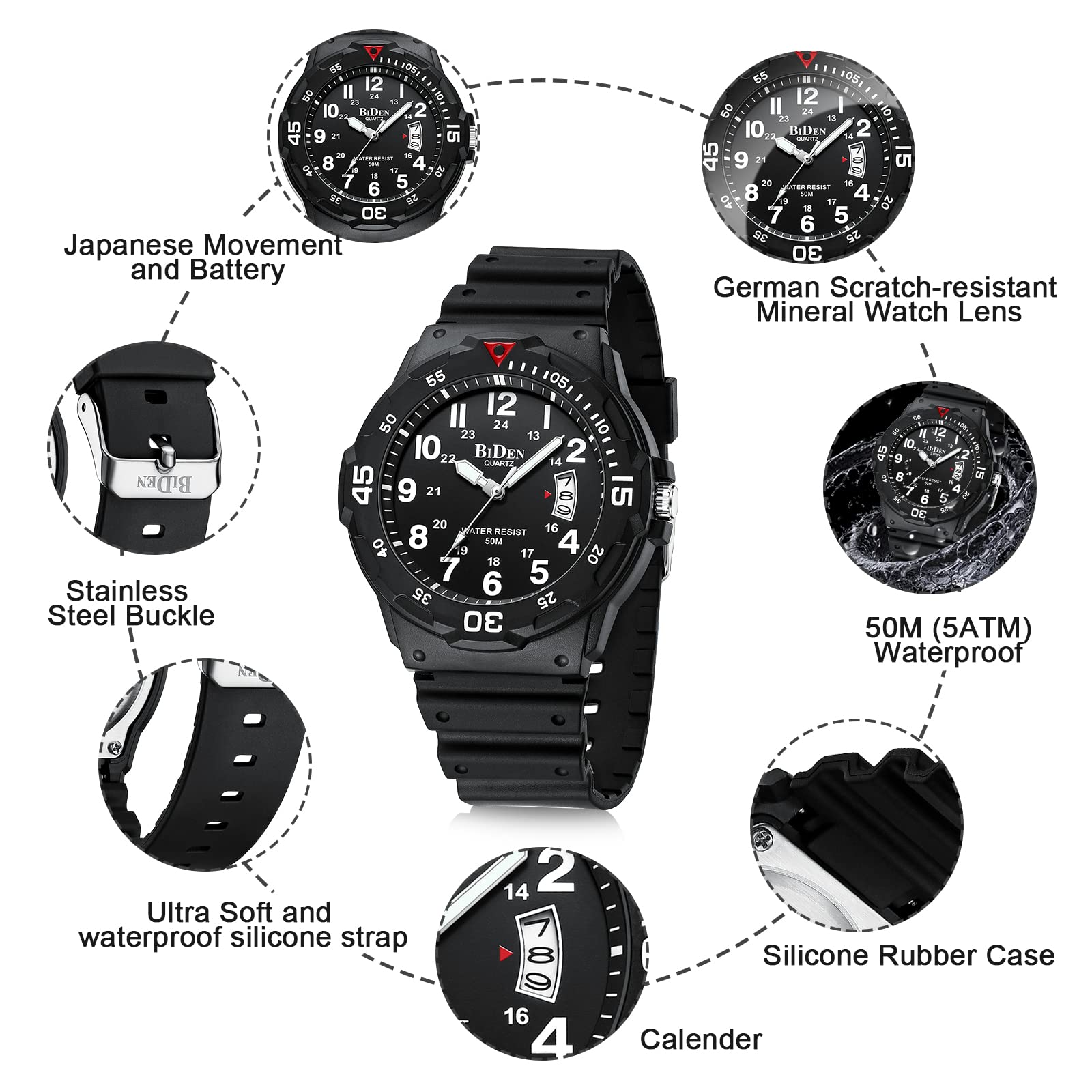 - ⌚ Analog Quartz Watch for Men: Mens watch made with anti-scratch mineral dial window and shock-resistant stainless steel case, exquisitely crafted. Ultra soft plastic strap, wear-resistant and scratch-resistant, breathable, easy to maintain. A great present for your father, lover, boyfriend, or other male friend.
