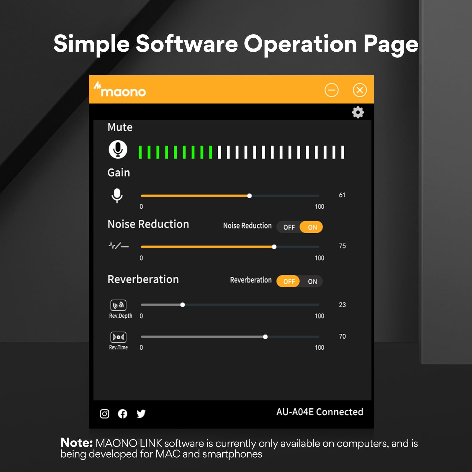 - Enjoy Your Gaming Without Noise Distractions: Built-in sound card chipset, ultra-low noise circuit design. AU-A04E podcast microphone's precise cardioid pickup pattern focuses on your voice, and reduces pickup of sounds from the sides and rear, improving isolation of desired sound source. MAONO LINK software digital hybrid active noise canceling blocks out noises so you can stay focused