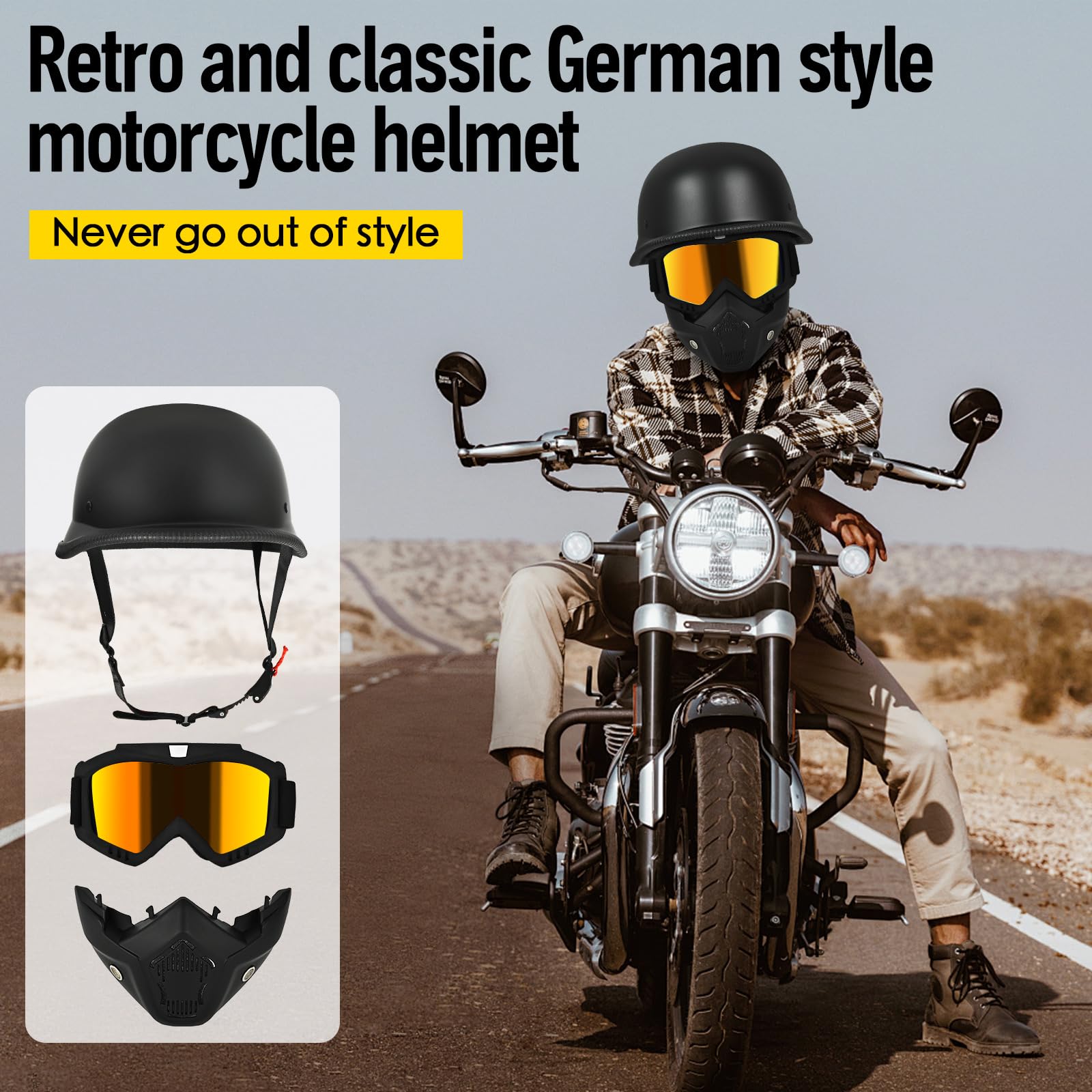 Motorcycle Helmet German Style Half Helmet Skull Cap Adult Men Women Half Shell Helmet, DOT Approved Retro Half Face Helmet for Cruiser Scooter Chopper (3Matt Black,X-Large)