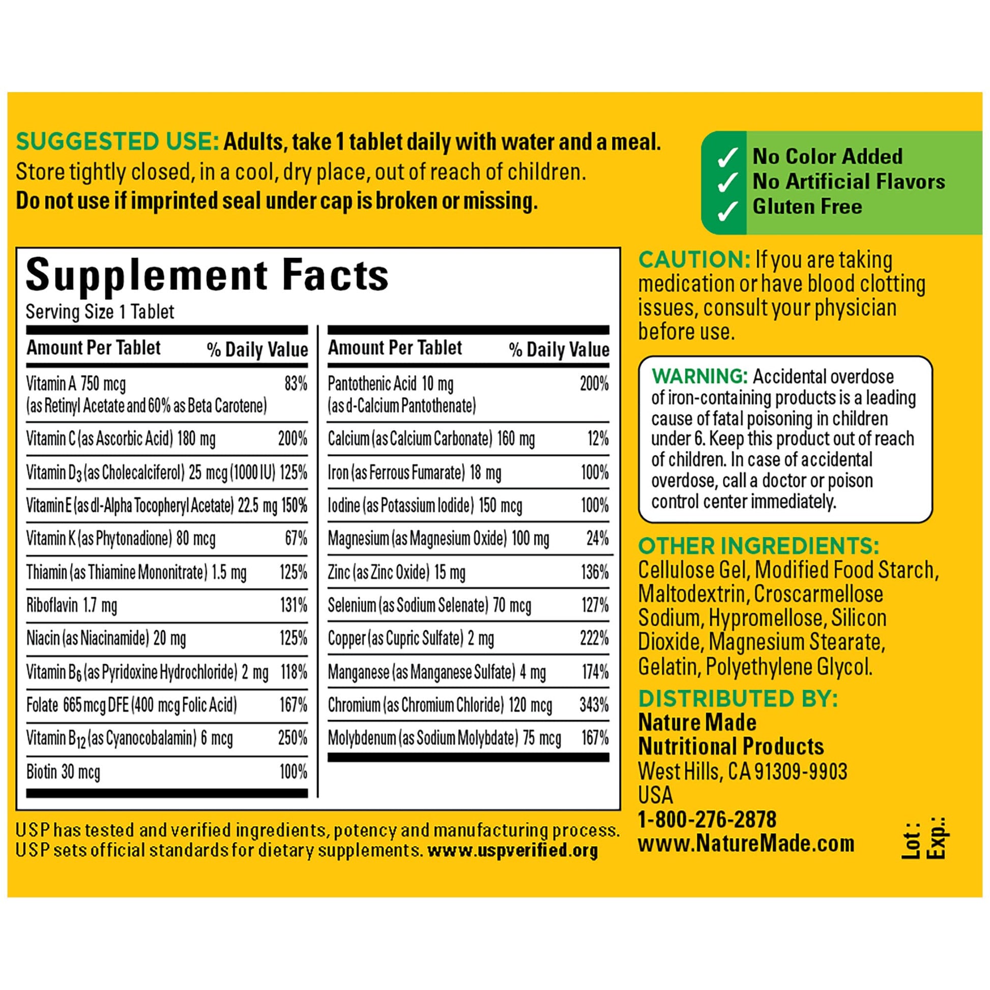 Details: Nature Made Multivitamin with Iron Tablets help support immune health, muscle and bone health, and energy metabolism(1). Made in the USA with quality global ingredients, these adult multivitamin tablets contain no color added, no artificial flavors, and are gluten free. This Nature Made Multi is a dietary supplement that contains 23 key nutrients, including Vitamin A, Vitamin C, Vitamin D3, Vitamin E, and Iron for daily nutritional support. Adult multivitamin cognitive support with ingredients that help support healthy cognitive function. These adult multivitamins with Iron are a great choice for people who want to fill potential nutrient gaps in their diet. Adults, take one tablet daily with water and a meal. Nature Made supplements are quality you can trust. USP has tested and verified ingredients, potency, and manufacturing process. USP sets official standards for dietary supplements. Visit the USP verified website for more information. (1)Helps convert food into cellular energy.