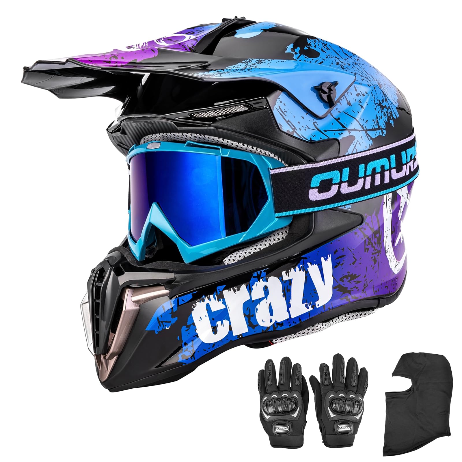 OUMURS Adult ATV Dirt Bike Helmet with Gloves & Mask Adjustable Sun Visor Motorcycle Adult Helmet Off-Road Motocross Downhill Moped MX for Unisex-Adult-Crazy Blue, L
