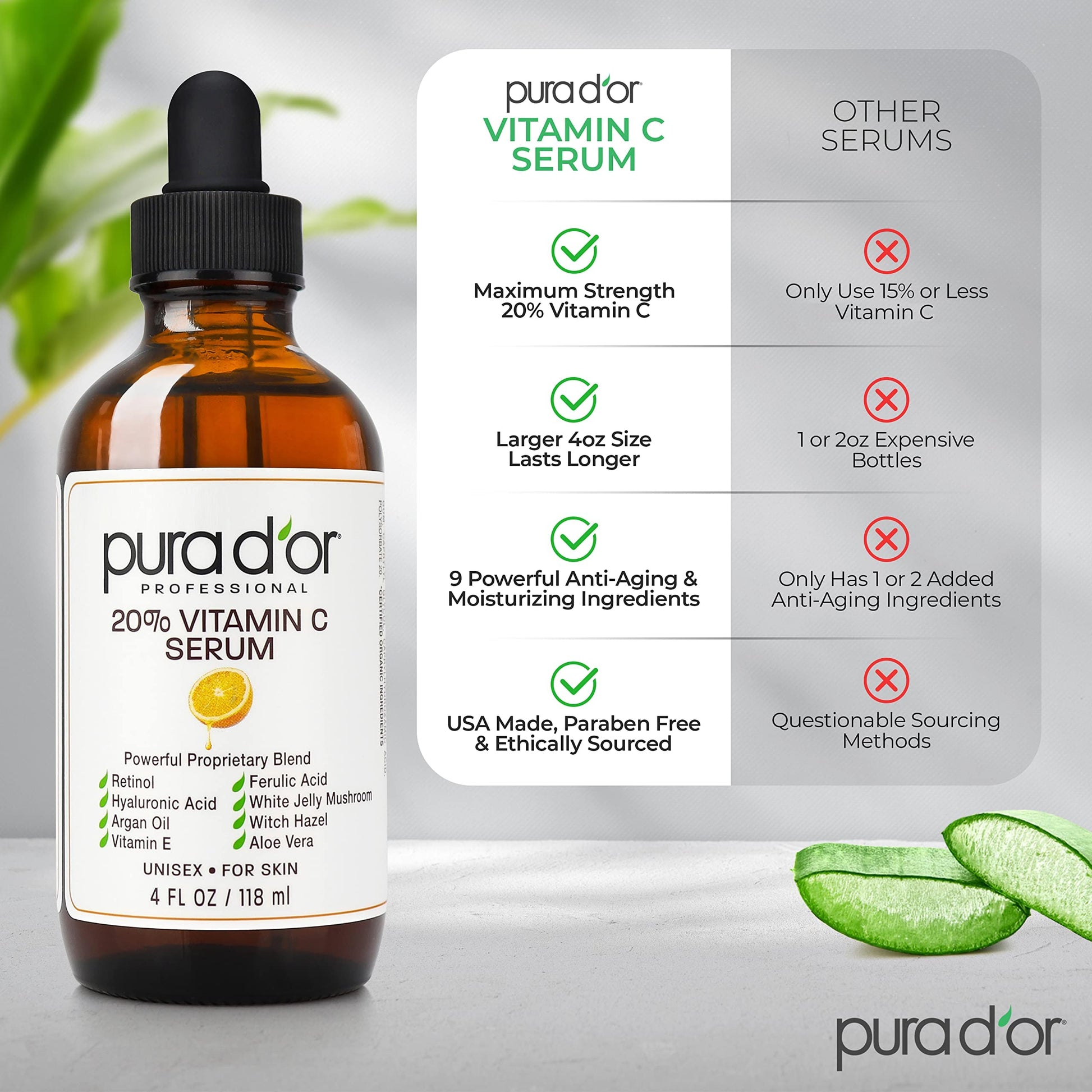 Details: PURA D'OR 20% Vitamin C Serum for face is rich in vitamins and minerals. This overnight hyaluronic acid serum contains a 3.0 pH level and functions as a skin brightening and anti-aging retinol serum. After washing your face at night, apply a sufficient amount of face moisturizer and leave in overnight. The hyaluronic acid and ferulic acid help in reducing the appearance of wrinkles, scars, and fine lines while keeping your face hydrated and naturally moisturized. Our Vitamin C Serum is free from harmful chemicals and made without artificial scents. It is produced in a U.S. facility that uses a renewable energy source.
