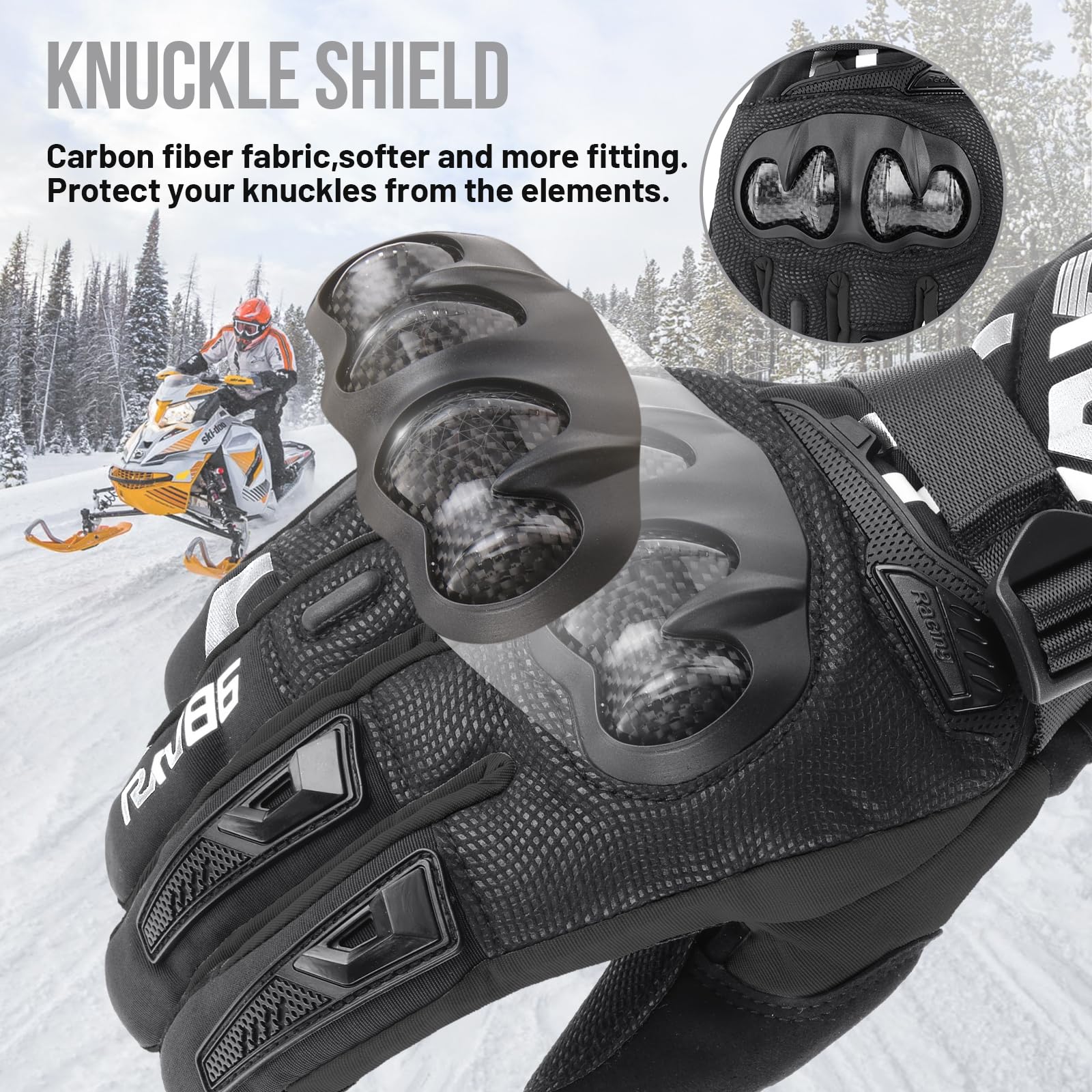 - CARBON FIBER HARD SHELL PROTECTION: The motorcycle winter gloves are designed with a hard carbon fiber shield. The carbon fiber shield can accurately fit the natural curvature of the hand. It has a shock-absorbing function to better protect your finger joints from shock and impact, and is durable enough to withstand collisions
