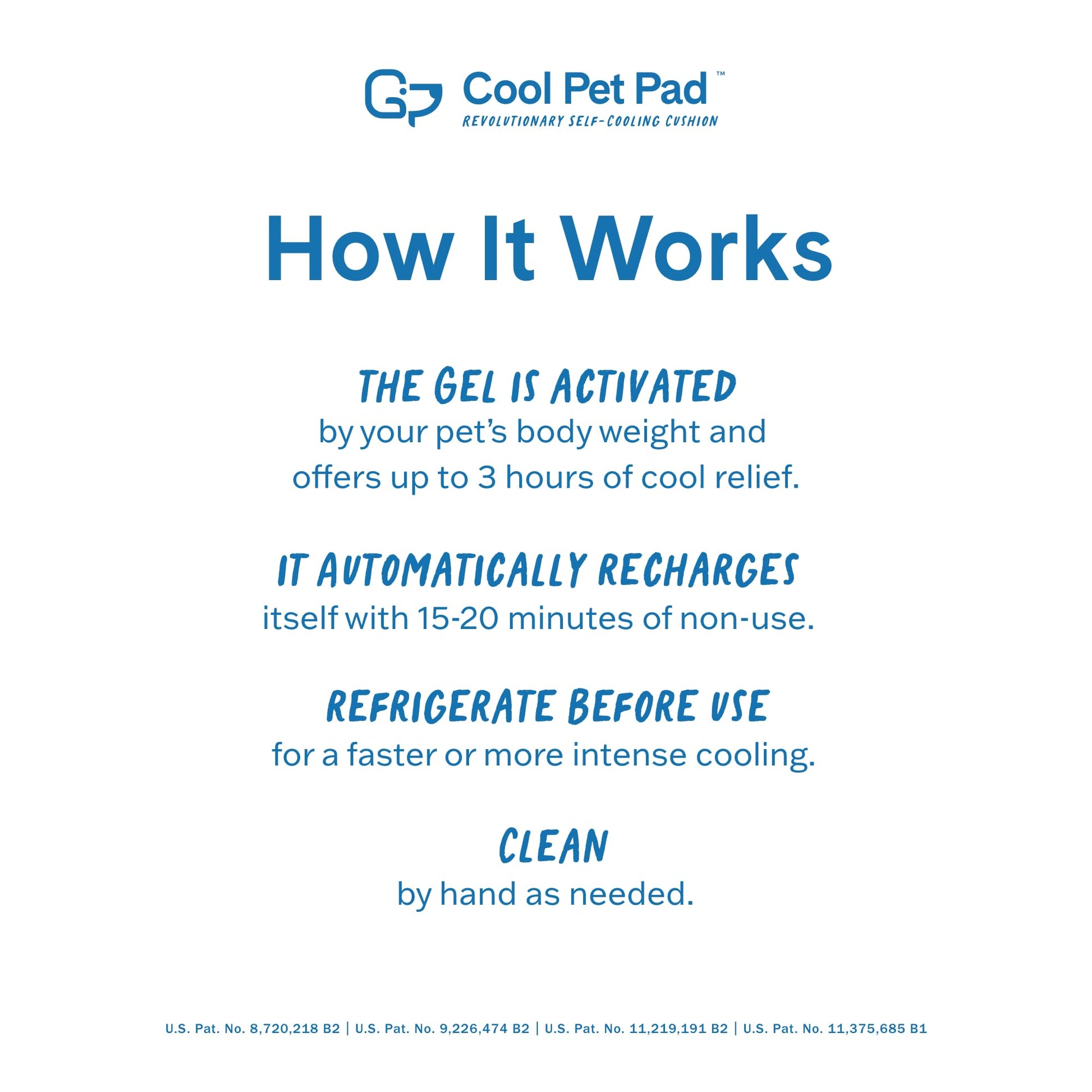 - PRESSURE ACTIVATED - Our patented gel formula works without water, electricity, or refrigeration. Once your pet lays on the pad, it goes to work immediately, and then automatically recharges after 15-20 minutes of non-use.