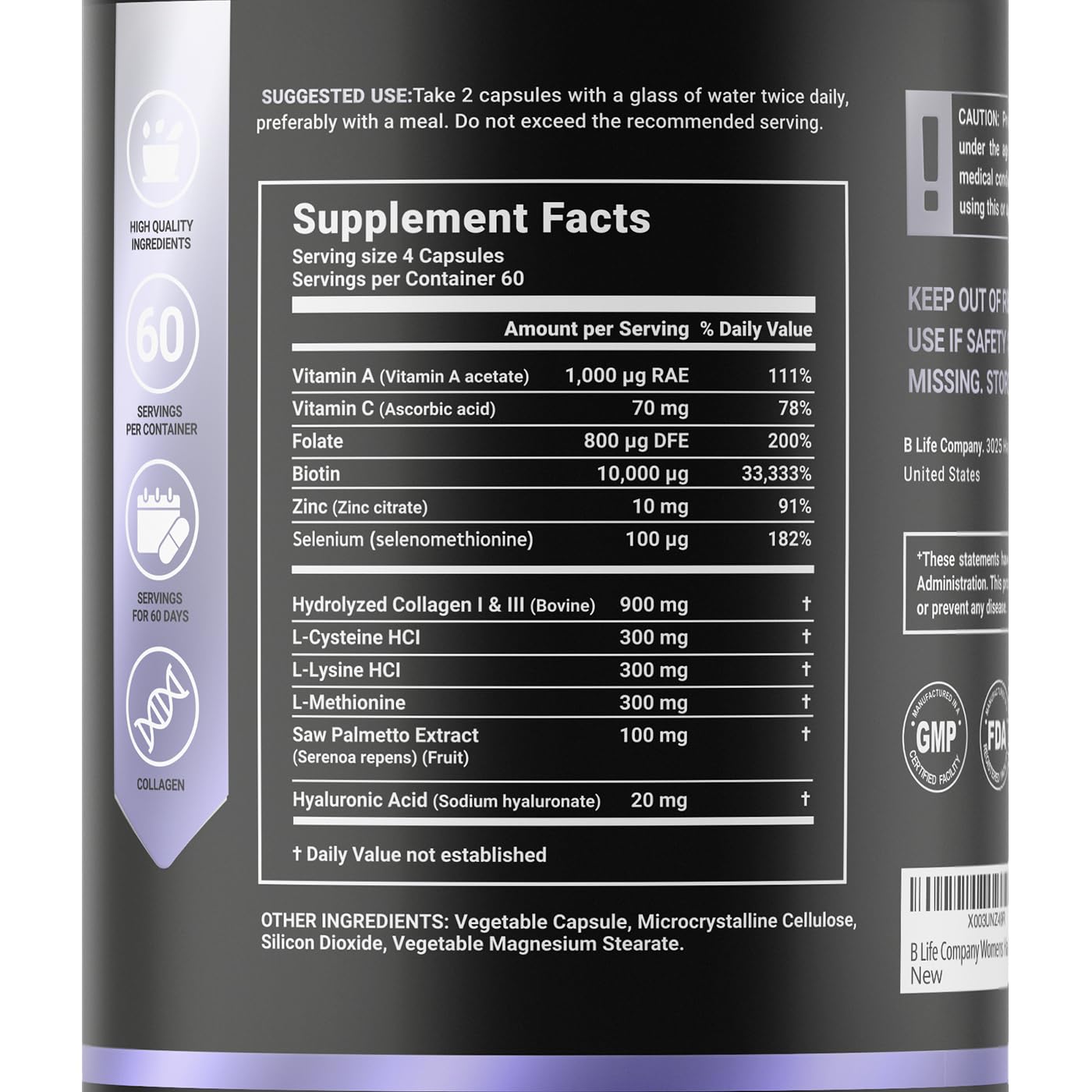 Women's Hair Growth Supplement with Natural Ingredients: Biotin, Hydrolyzed Collagen I & III and Amino Acids | 240 Caps - 60 Days - 10,000 mcg Biotin per Serving | Made in The USA by B Life.