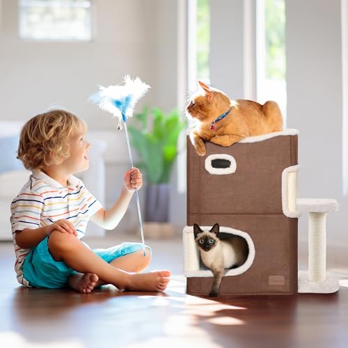 YITAHOME 2-Tier Cat House, Indoor Cat Cave Bed Playhouse, Flannel & Cool Mat, Covered Cat Beds with Scratch Pad and Hideaway Cave, Cute Modern Cat Condo Furniture for Multi Small Cats, Brown